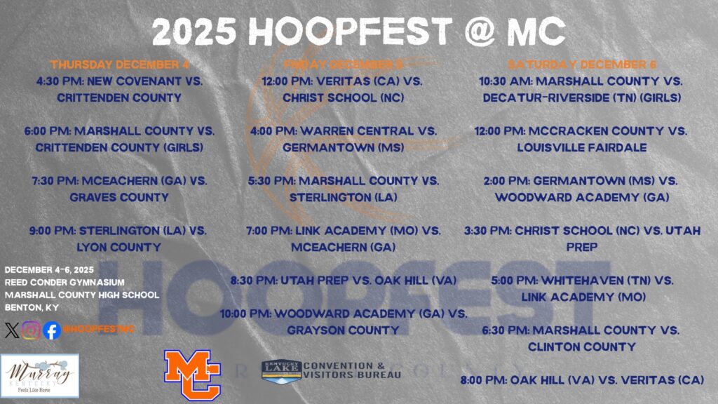 The action tips off on Thursday, December 4, and continues through Saturday, December 6, with full-day sessions featuring teams from Kentucky, Georgia, Louisiana, North Carolina, Mississippi, Missouri, Virginia, Tennessee, and California. Games will be played inside Reed Conder Gymnasium at Marshall County High School, located at 416 High School Road, Benton, KY. Check out the full game schedule on the event graphic above or follow @HoopfestMC on Facebook and Instagram for updates, ticket giveaways, results, and behind-the-scenes content.